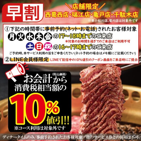 事前予約の上、対象時間にご来店いただくと、お会計(税込)から《10%割引》いたします!