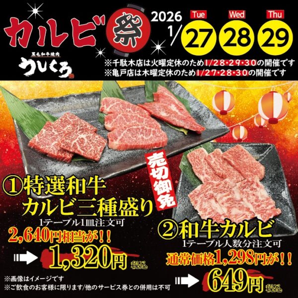 今月は、2026/1/27(火)・28(水)・29(木)の3日間限定で<カルビ祭り>を開催!