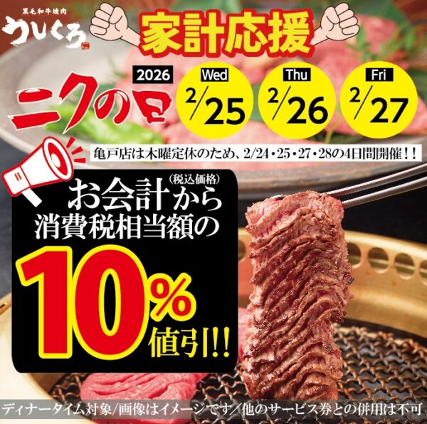 2026/2/25(水)・26(木)・27(金)の3日間、お会計(税込価格)から消費税相当額の10%を値引きいたします!