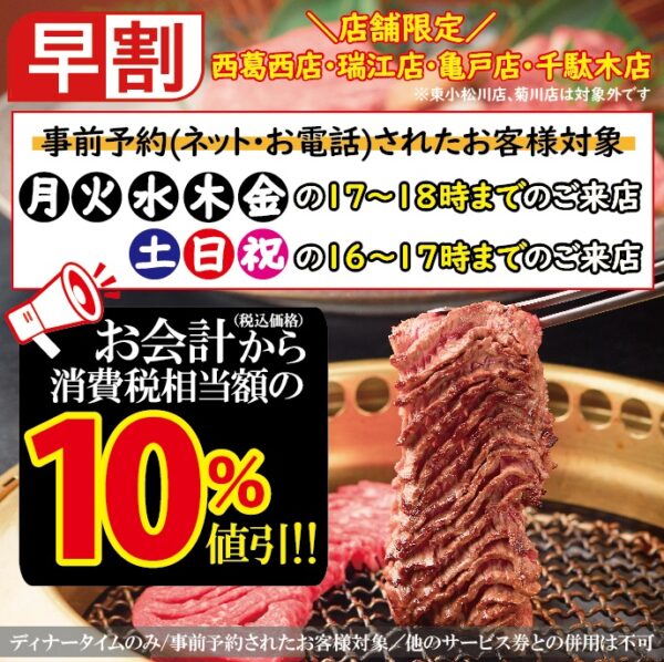 事前予約の上、対象店舗に早い時間にご来店頂くと、お会計金額(税込)から消費税相当額の10%を割引します!