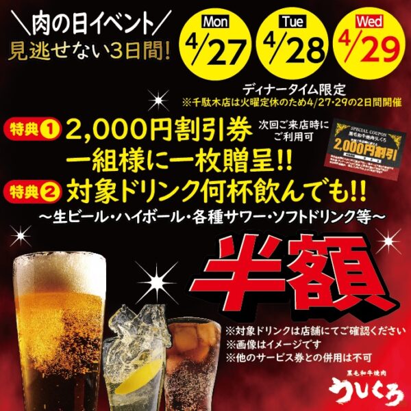 うしくろでは、2026/4/27(月)・28(火)・29(水)の3日間、肉の日イベントを開催します!